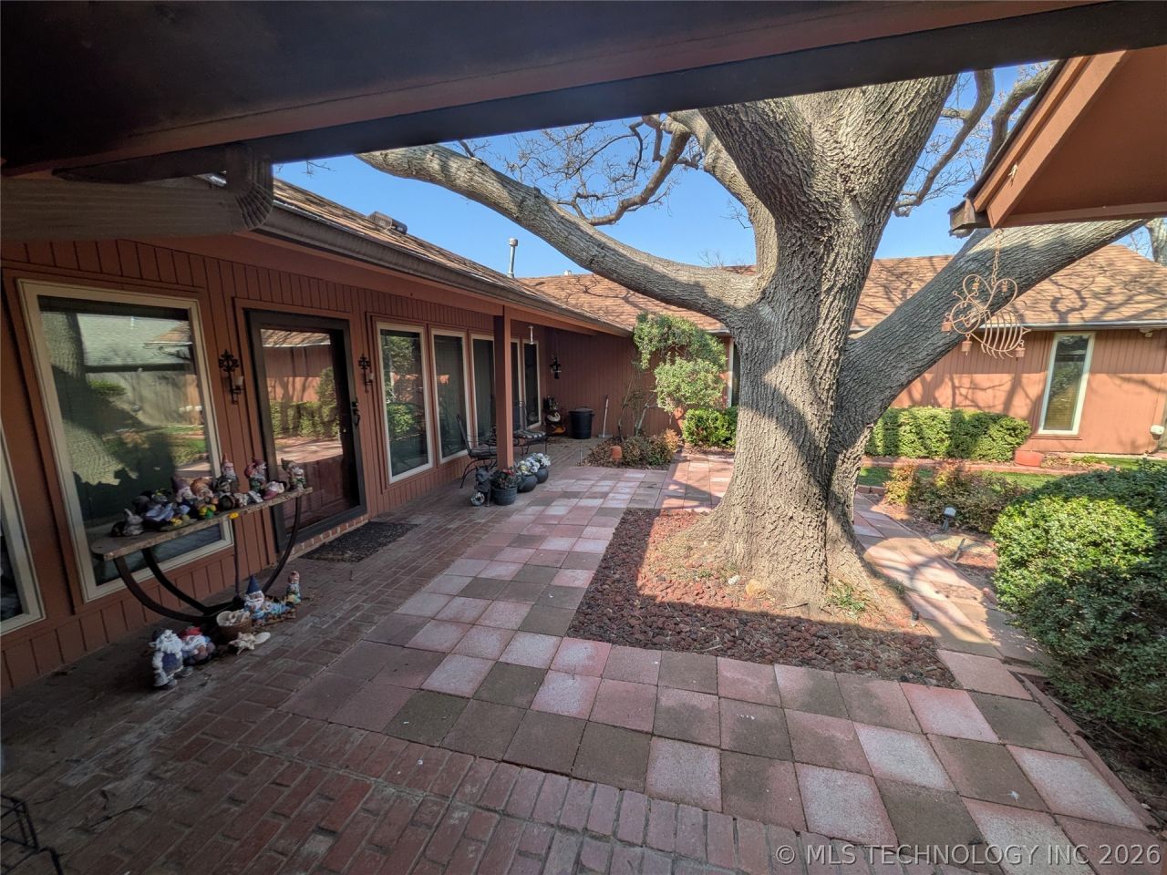 Welcome to this 3-bedroom, 2-bath home with a gated courtyard entry centered around a mature shade tree, creating a private and inviting outdoor space. The courtyard provides a quiet place to relax just steps from the main living areas. Large windows from the living and dining rooms overlook the courtyard and bring natural light into the home. Inside, the home offers a comfortable living room with a fireplace and a dining area with access to the backyard. The kitchen includes generous counter space, a peninsula with additional storage, electric range, dishwasher, refrigerator, and abundant cabinetry. Just off the kitchen is a laundry room with washer and dryer hookups and built-in cabinets. The primary suite features a spacious bathroom with a jacuzzi tub, separate shower, vanity area, and a closet that includes a built-in safe room/storm shelter. Two additional bedrooms offer ceiling fans and closet space and share a full hallway bathroom with a step-in shower. The backyard includes a covered patio that provides shaded outdoor space, along with privacy fencing and a storage shed. The property also includes a detached two-car garage. Property is being sold as-is, and personal property remaining at closing will convey with the property.